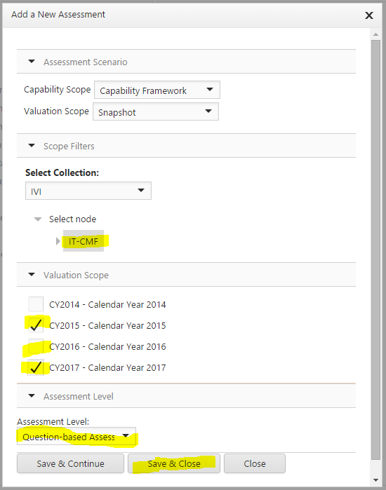 For IT-CMF Executive Assessment, make sure you are using IVI in collection field and IT-CMF in the domain field. For other executive assessments, choose appropriate collection and domain from the dropdown lists.