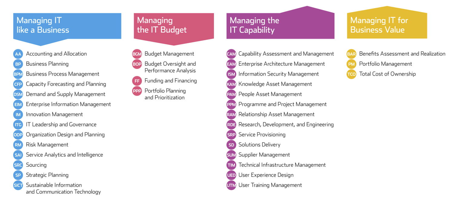 IT Capability Maturity Framework from Innovation Value Institute is an IT management framework, providing an overarching model for organizing, planning and managing IT capabilities for on-going business value.