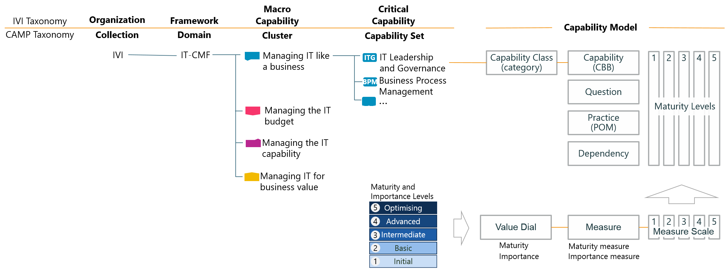 IT-CMF content is organized into a simple hierarchy with 35 critical capabilities (CCs) in 4 macro capabilities. Each critical capability consists of one or more categories. Each category consists of one or more capability building blocks (CBBs). Each CBB is described along a maturity scale of 1 to 5. A CBB have one or more questions. Each question has a response for each level of maturity. A CBB may have one or more practices for achieving a level of maturity. In addition of a description, the practice also includes associated outcome and metrics. The content also includes dependencies between critical capabilities. From a perspective of a specific critical capability, the dependencies can either be input dependencies or output dependencies.